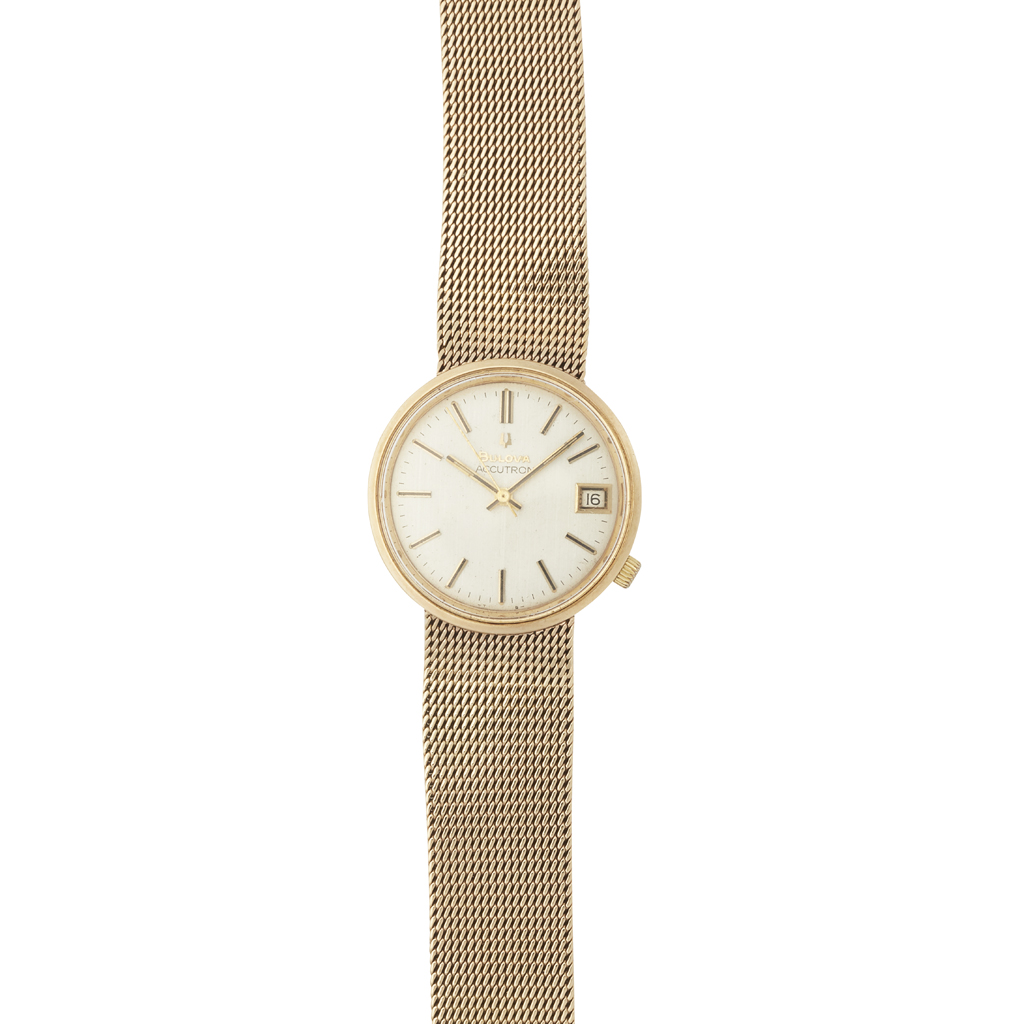 Accutron, silvered brushed dial with gilt baton indicators, sweep second hand, date aperture and crown at 4, integral heavy 9ct gold mesh link bracelet, fold over clasp