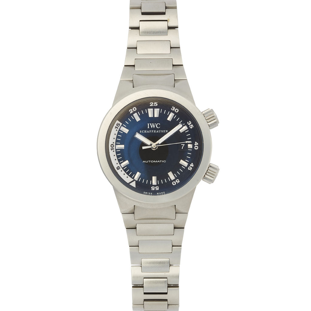 Aquatimer, black dial, second rotary omni-directional inner dial, sweep second hand, polished hour indicators, date aperture, screw down crowns, tapering steel bracelet, with case