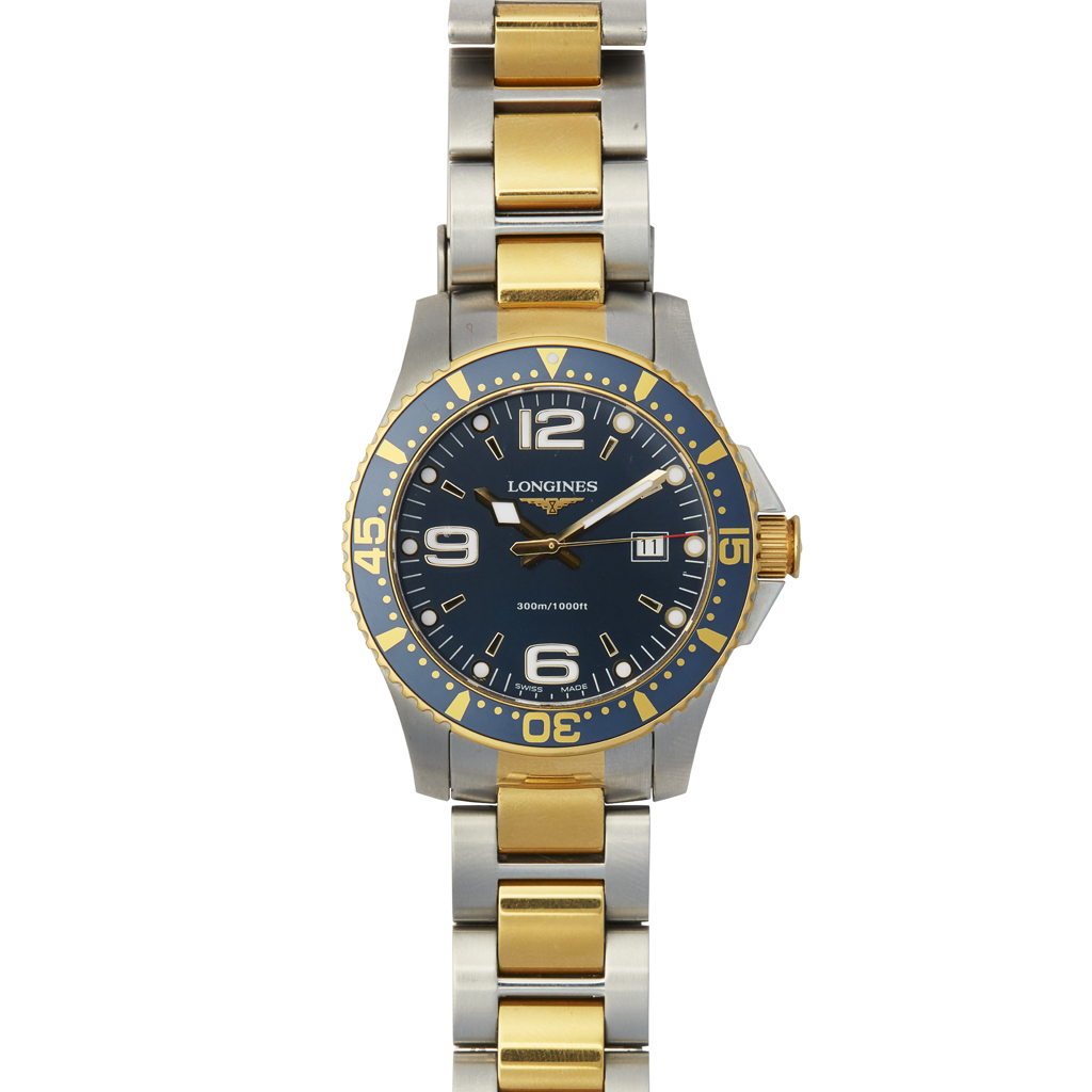 Hydro Conquest, metallic blue dial, sweep second hand, bold white Arabic numerals, date aperture, rotating blue and yellow metal bezel, two tone bracelet, fold over double clasp with boxes