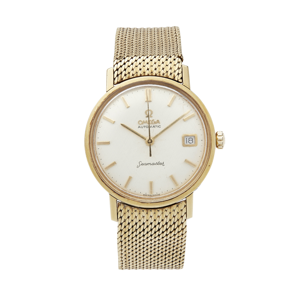Seamaster, brushed silvered dial, baton indicators, sweep second hand, date aperture, Omega 18ct gold heavy flexible link bracelet, fold over clasp