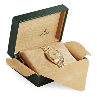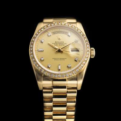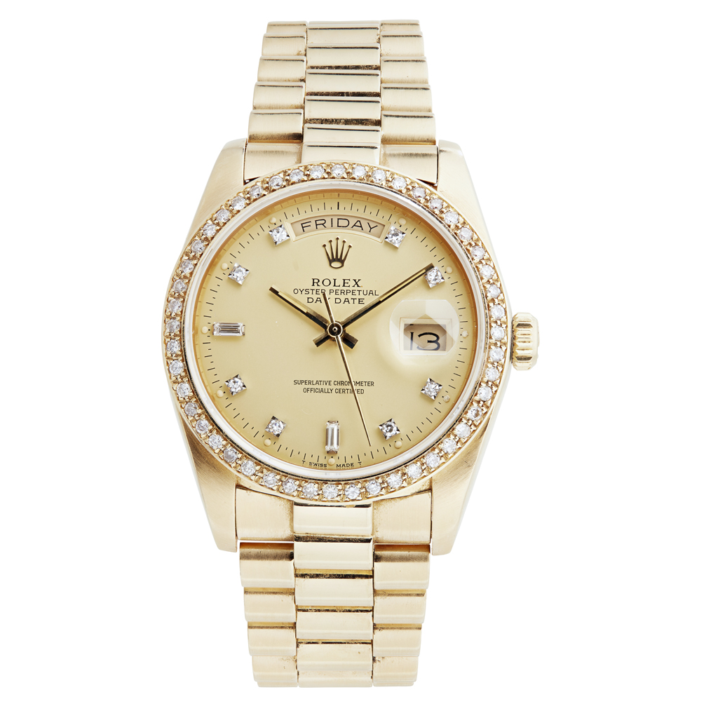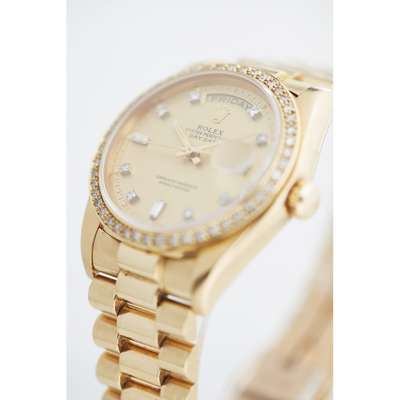 Oyster Perpetual Day Date, ref. 18038, champagne dial, round and rectangular cut diamond indicators, sweep second hand, date aperture, screw down crown, President bracelet, serial no 8334224, leather case, cardboard outer case