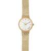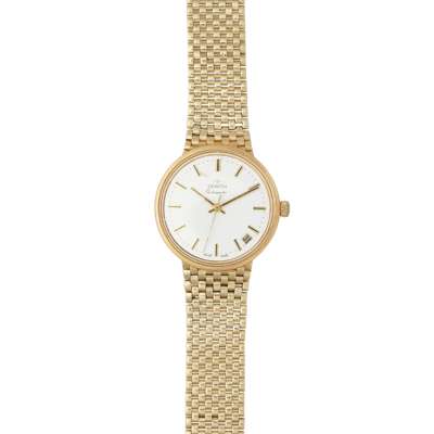 the plain white dial with gilt hands and baton indicators, date aperture at 4, integral polished link bracelet, fold over clasp