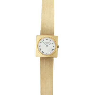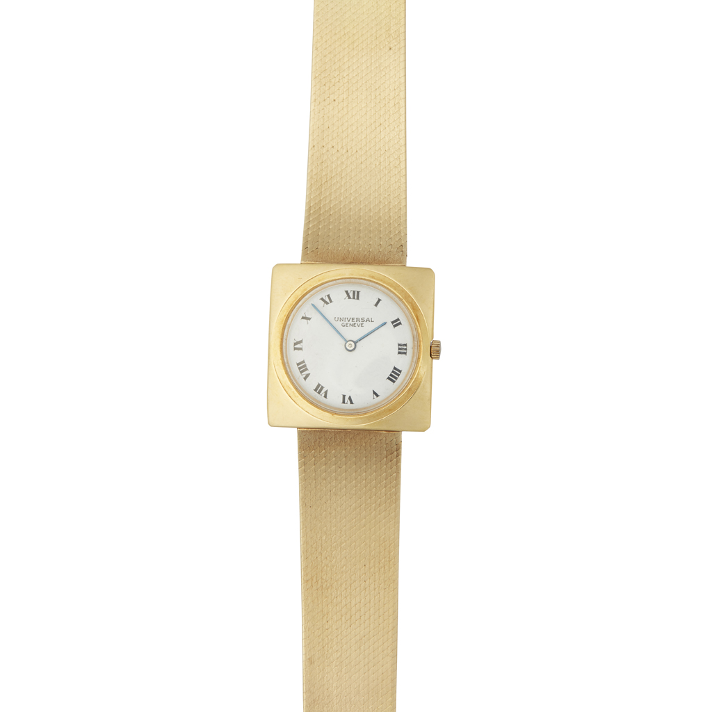 Universal, Genève, probably 1970s, curved square case. white enamel dial, Roman numerals, with an integral heavy close liked mesh bracelet, fold over clasp, marked 14kt