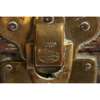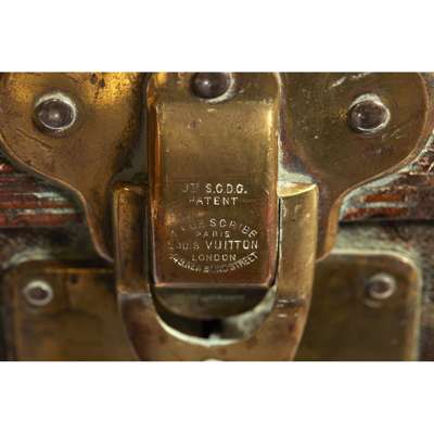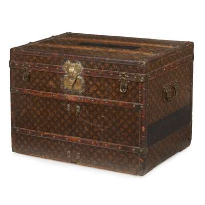 Late 19th century, covered in signature monogram canvas with brown leather trim and wood straps with brass stud details, stamped brass hardware and black metal handles, with a void linen lined interior