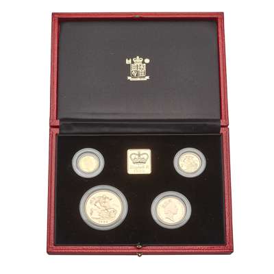 1990, £5, £2, sovereign and half sovereign, with certificate