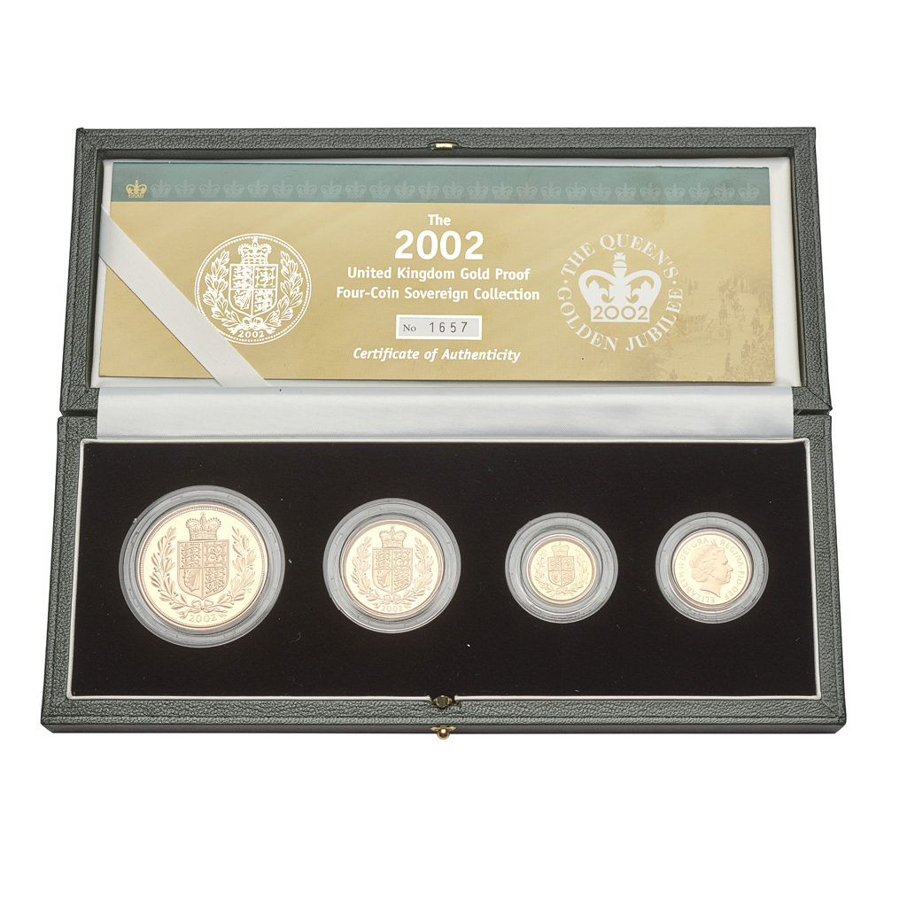 2002, £5, £2, sovereign and half sovereign, with certificate