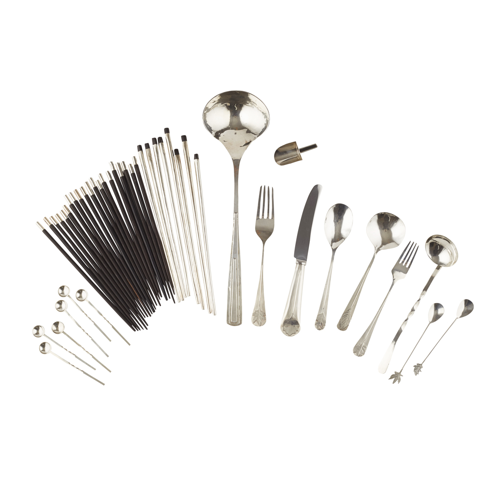 to include; a soup ladle Sheffield 1990, the bowl of planished finish, tapered terminal with applied stepped detail; a sauce ladle, 1991 with twisted stem; six coffee spoons with similar handles; an ebony mounted caddy spoon, 1991; a table fork, table spoon, table knife, dessert fork, dessert spoon and two jam spoons all with leaf designs to terminals; together with 14 pairs of silver and ebony chopsticks, 1992