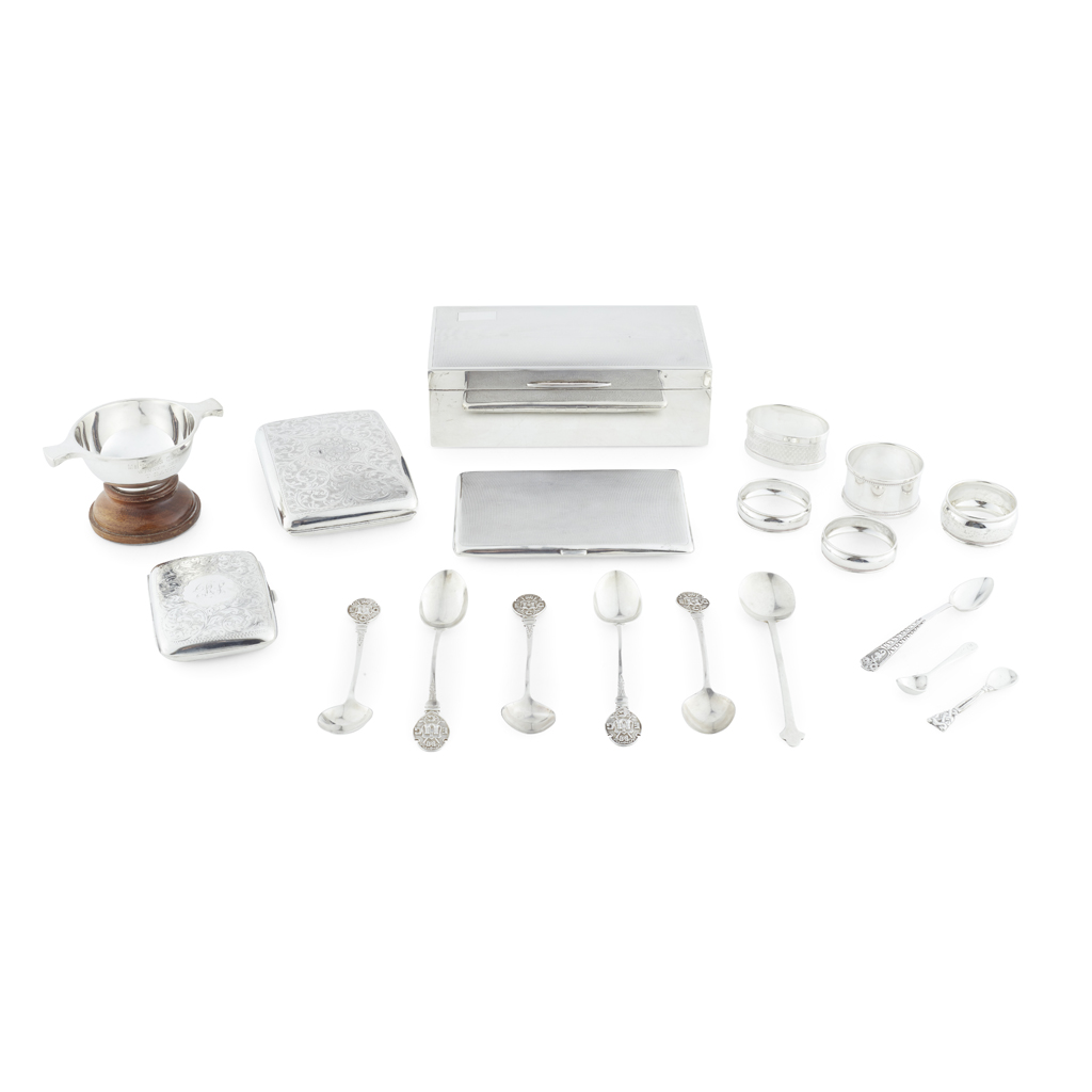 A E Poston & Co Ltd, Birmingham 1947, of rectangular form, engine turned detail to lid, flange thumbpiece; together with a cigarette case Joseph Gloster Ltd, Birmingham 1916, of bowed rectangular form, foliate engraving throughout, gilt interior, engraved to inside; another smaller; an engine turned cigarette case; together with a collection of napkin rings, various teaspoons and a presentation quaich surmounting a wooden plinth (qty)