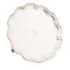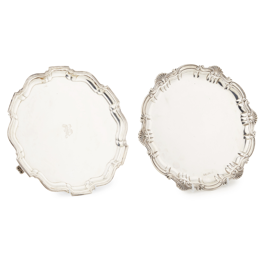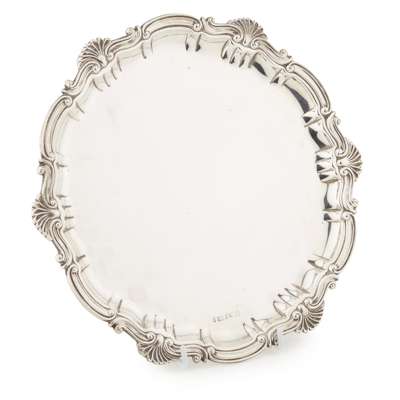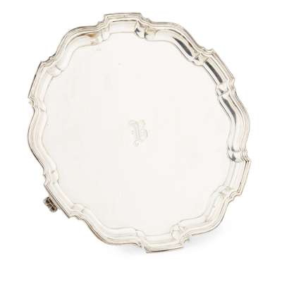 Barker Brothers Silver Ltd, Birmingham 1933, of shaped circular outline, raised piecrust border, Gothic B engraved to centre, raised on three scroll bracket feet; together with a card tray J.R., Sheffield, of shell and scroll raised border, raised on three ball and claw feet (2)