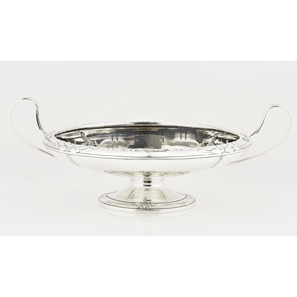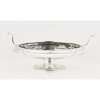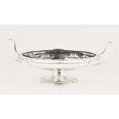Walker and Hall, Sheffield 1927, of circular form, the shallow dish with embossed floral detail border, elongated handles, raised on a spreading foot with similar border
