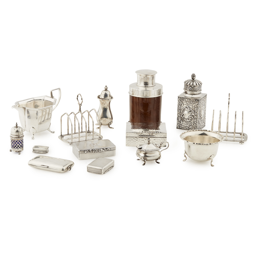 Birmingham 1908, of cylindrical form, pull off silver lid; together with a George III vinaigrette, Nathanial Mills, London; a Victorian tea caddy, William Comyns retailed by Goldsmith & Silversmiths Company, of square form, pull off domed lid, heavily embossed decoration throughout; a milk jug, Viners Ltd, Sheffield 1931, of octagonal form; a cigarette box; sugar basin; a pair of toast racks; various condiments and cigarette boxes (qty)