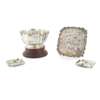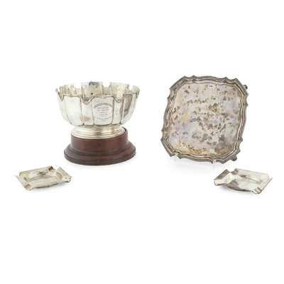 William Comyns & Sons, London 1905, moulded rim, presentation engraving 'Clare College Athletic Sports ... R. N. Postlethwaite 1906' raised on a pedestal foot; together with a card tray, Walker & Hall, Sheffield, 1933, of moulded square form, presentation engraving to centre and a pair of ashtrays (4)