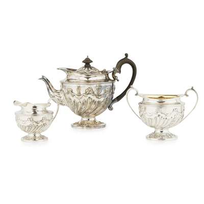 Brook & Son, Edinburgh 1904, comprising teapot, twin handled sugar bowl and milk jug, all of circular outline, demi-fluted body with swag detail, S scroll handles, domed finial to teapot raised on (3)