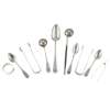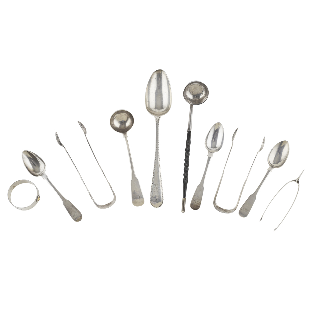 to include a bright cut decorated table spoon marked JH, a fiddle pattern teaspoon Robert Dickson, Dundee; J&G Heron toddy ladle, of Fiddle pattern; a pair of wishbone tongs, MacRobb, a napkin ring; two pairs of Edinburgh tongs; a baleen twisted punch ladle, and two Edinburgh teaspoons (qty)