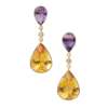 each collet set with a pear cut amethyst suspending a larger pear cut citrine, with a round-brilliant cut diamond spacer, set to a matte 18ct yellow gold post and butterfly fittings