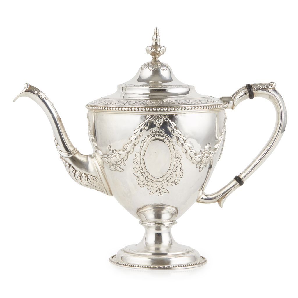 Patrick Robertson, Edinburgh 1781, of tapered vase form, embossed swags to body, cartouche with crest to one side, vacant to the other, hinged lid with chased floral border and finial, leaf clasped C scroll handle and similar spout, raised on a spreading foot with beaded border