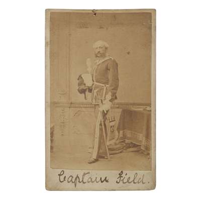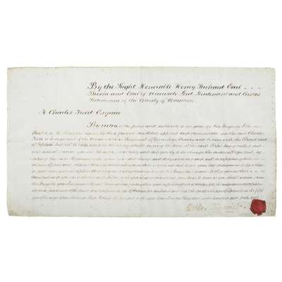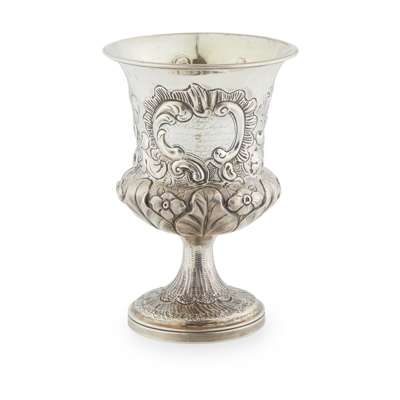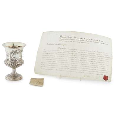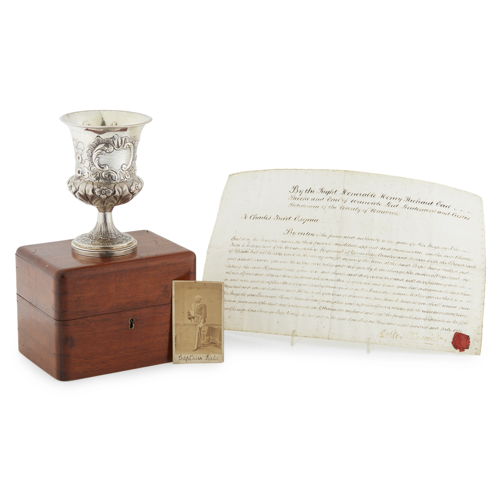 John Langlands II, Newcastle 1799, of goblet form, flared rim, repoussé decoration of roses and floral sprays, engraved cartouche, "From Lt Col Marten, commanding the Royal Dragoons to Lt ADJ., Field on his retirement 1841", together with a photograph of Captain Field and also his commission dated 1841 being Adjutant of The Warwickshire Regt. in a 'caretaker' capacity, the goblet in a well made mahogany fitted box