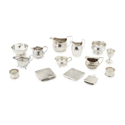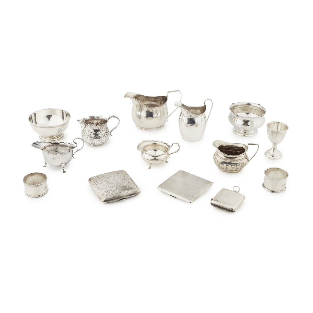 to include: two sugar bowls; a small sauce boat; five various cream jugs, one George III, a combination sovereign, half sovereign keeper with Vesta; two napkin rings; two cigarette cases and an egg cup (qty)