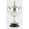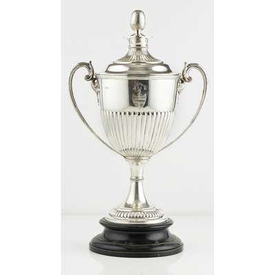 possibly Charles Boyton, London 1899, of vase form, demi-fluted body leaf clasped C scroll handles, beaded detail to stem, raised on a stepped foot, with ebonised wooden base, Duke of Fife armorial engraved to one side, presentation engraving to the other, 'GIFTED TO THE Lieut G.B. Duff... by the servants of Hatton Castle...1900', the cover of similar design with acorn finial, all on an ebonised turned wood socle base