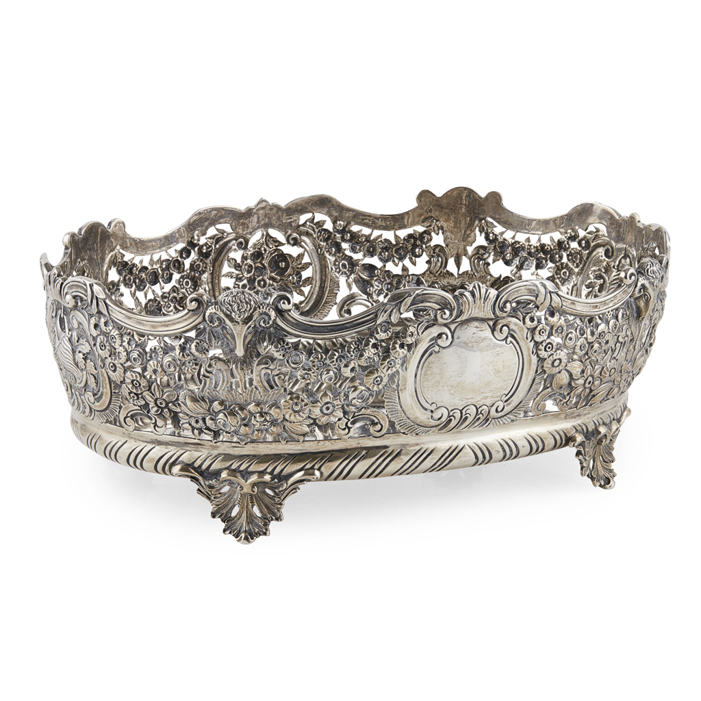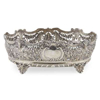 S.B. London 1895, of oval form, with raised pierced sides, foliate decoration throughout, raised on four cast foliate bracket feet
