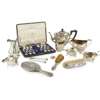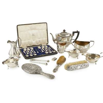 G.B. London 1893, comprising a teapot, twin handled sugar basin and milk jug, all of oval form, demi-fluted body, angular handles; together with a cased set of twelve teaspoons and pair of tongs, Glasgow; three various cream jugs; a pair of tongs; a \victorian snuff box, a dressing table set and a plated cream jug