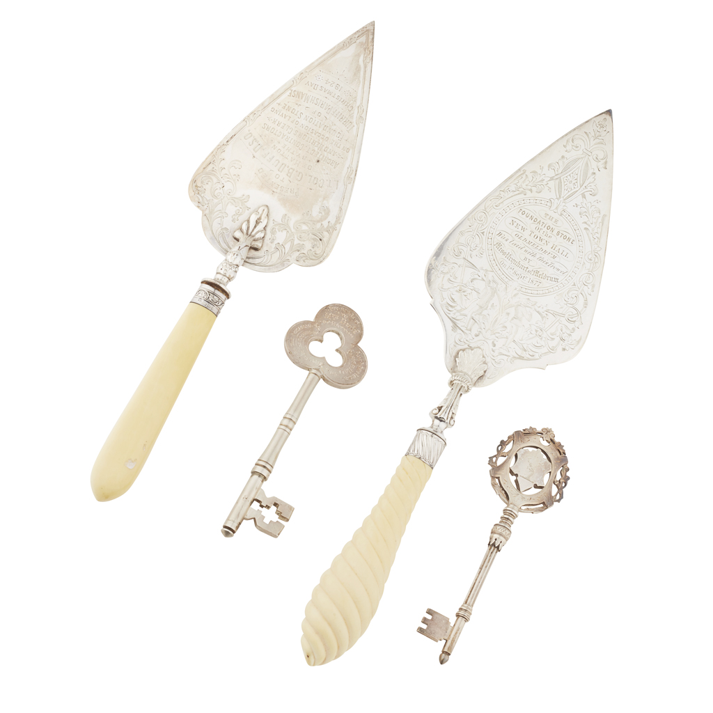 to members of the Duff family of Hatton, a silver key, JF, Chester 1893, ornate grip engraved relating to Turriff Parish Hall; another marked Sterling relating to Auchterless Parish Hall; a trowel, the silver blade engraved relating to Turriff Parish Manse 1924, cast stalk to an ivory handle; another trowel, unmarked, relating to opening of Old Meldrum New town Hall, wrythen ivory handle