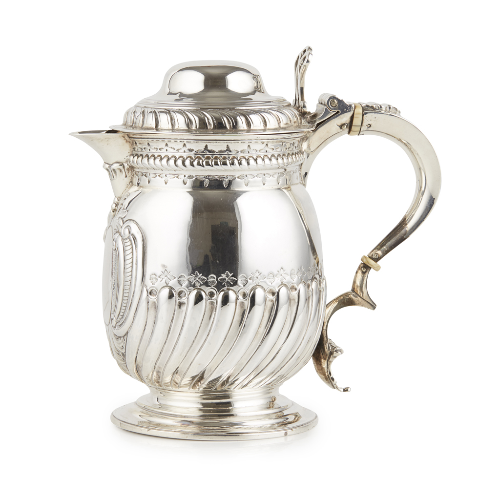 Martin, Hall & Co, London 1891, of compressed baluster form, demi-fluted body, vacant oval cartouche to body, sparrow beak spout, stepped domed lid with ornate thumb-piece, S scroll handle, raised on a stepped spreading foot