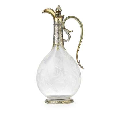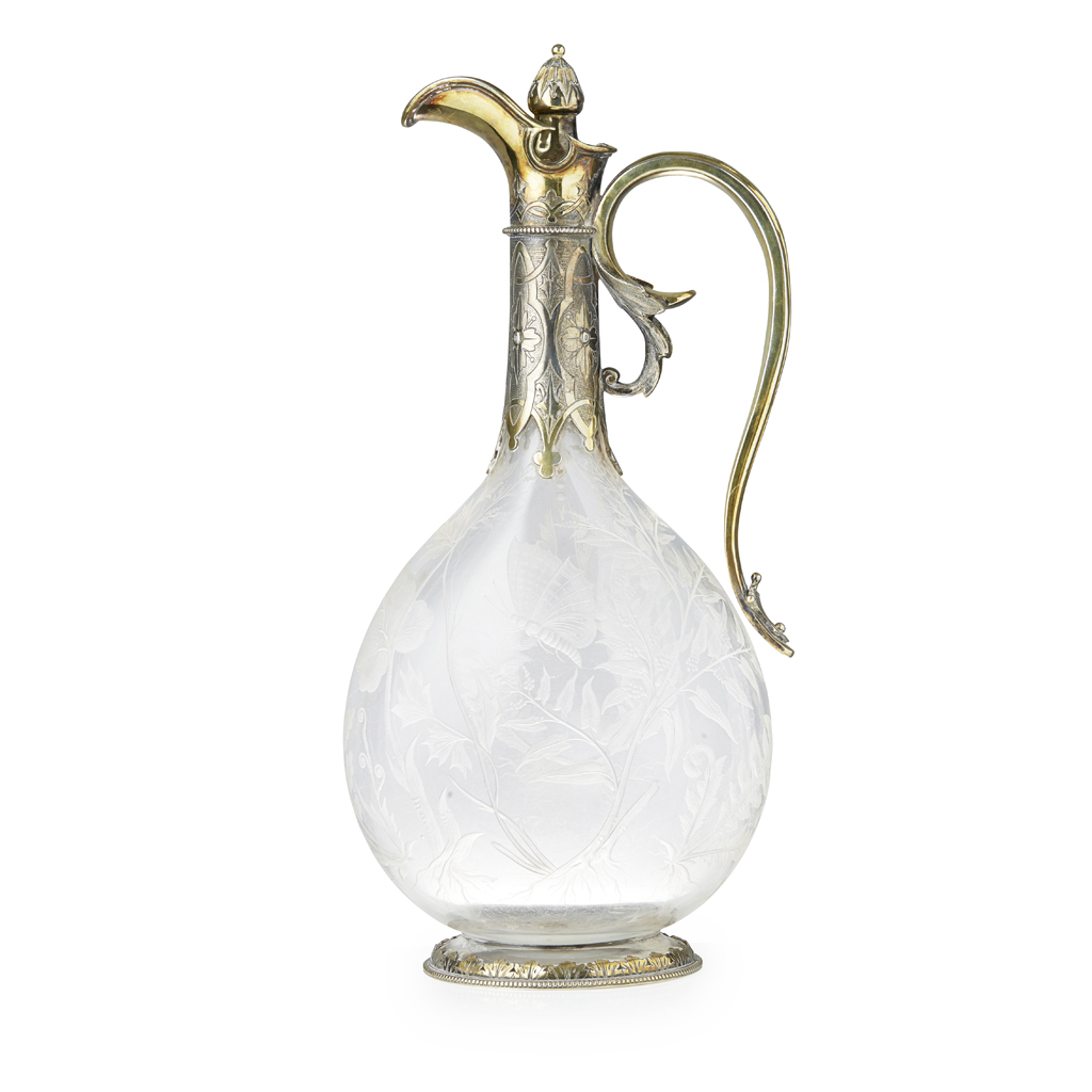 George Fox, London 1866, of flattened bottle form, with fern, foliate and fauna engraved detail to glass body, the long neck with silver gilt engraved collar, hinged cover with knopped finial, flared spout, foot rim with applied silver gilt border
