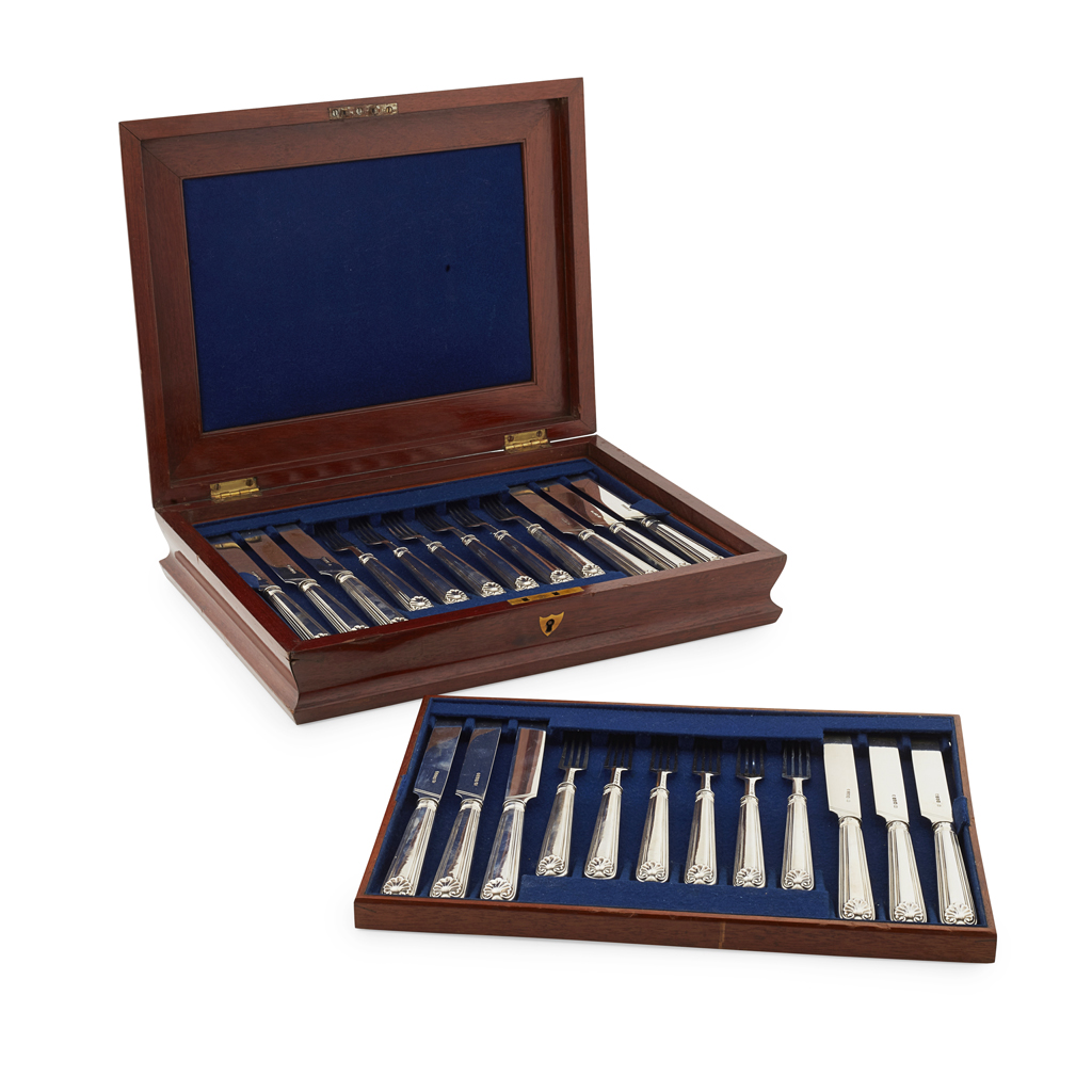 AH, Sheffield 1853, comprising eighteen knives and eighteen forks all of a modified threaded shell pattern handles, presented in a three-tier fitted mahogany case