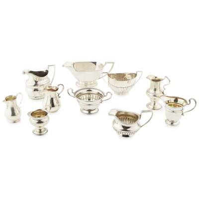 to include; an Irish George III cream jug, bright cut engraving; six other cream jugs including one Victorian example; two sugar basins, an Art Deco style sauce boat (qty)