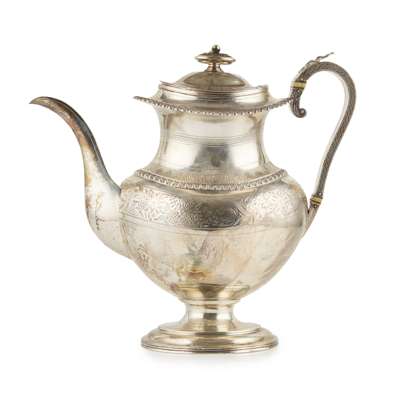 Chester, of oval baluster form, chased foliate detail throughout, shell clasped C scroll handle, engraved initials to body, raised on a stepped spreading foot