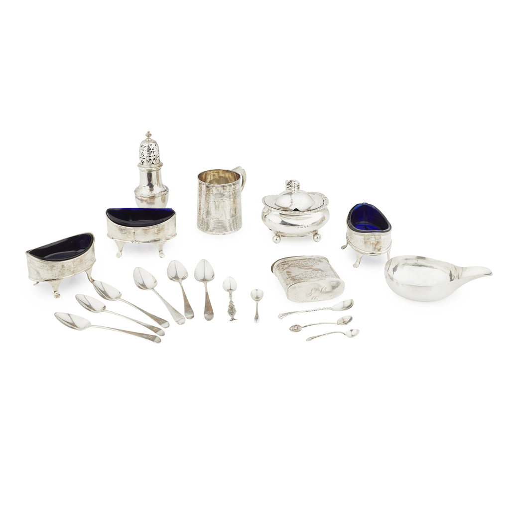 to include a Scottish provincial snuff box, unmarked, of oval form, chased floral decoration throughout; together with a George II caster 1731, of baluster form, pierced domed pull off lid; a pap spoon 1844; a George III christening mug 1810, a mustard 1892, raised on four ball feet, crest to lid; three unmarked oval salts with bright cut engraving and a collection of spoons (qty)