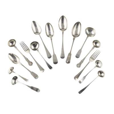 to include; eleven various 18th and 19th century table spoons, various dates, maker's and towns; a pair of table forks; a group of English sauce ladles, various dates and makers including two pairs of 18th century ladles; a modern pair of small ladles and a single; a group of Scottish ladles to include; a pair of fiddle pattern, Inverness, AML; Edinburgh, three pairs and a single; Glasgow, a pair; a cream ladle Fraser Howden, Edinburgh (qty)