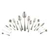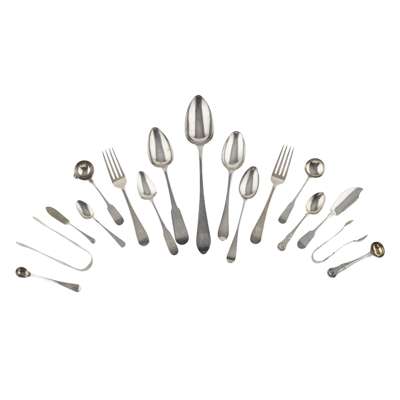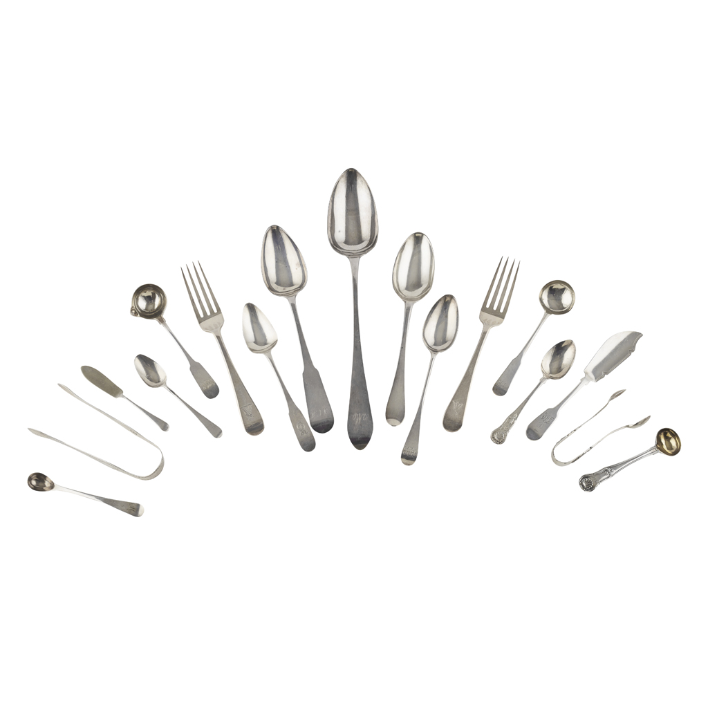 to include; Scottish late 18th century; a basting spoon; two table spoons; pair dessert spoons; set six dessert spoons; group of three, pair, and two single mid-18th century table spoons; a set of six Irish fiddle pattern dessert spoon; Dundee cream ladle; six table forks; various odd teaspoons and condiment spoons etc (qty)