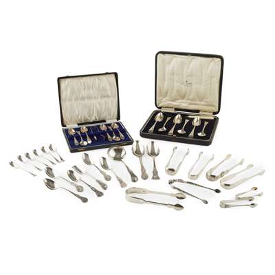 a mid-18th century pair of sprung tongs, BP circa 1760, bright cut and pierced decoration; six other 18th and 19th century tongs, various makers and dates; a cased set of six grapefruit spoons and knife and a cased set of teaspoons and tongs; with a group of various 19th century tea and dessert spoons, sugar shovel etc. (qty)