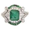 millegrain set with a trap cut emerald, in a border of similarly set of round-brilliant cut diamonds, and a further border of square cut emeralds (one deficient), the shoulders of scroll design millegrain set with round-brilliant cut diamonds, to an unmarked white metal shank