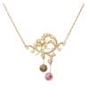 of pierced scrolling design set throughout with seed pearls, suspending two asymmetrical drops, each set with a round cut pink or green tourmaline, to an integral chain, unmarked