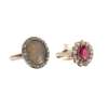 the central oval plaque with plaited hair in a border of old-cushion cut diamonds, to a plain yellow metal shank; together with a synthetic ruby and diamond set cluster ring, claw set with a oval cut ruby, in a border of rose cut diamonds, to a plain yellow metal shank (2)