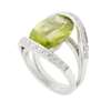 set with an oval mixed cut peridot between two rows of small round brilliant cut diamonds, to a plain white metal shank, unmarked