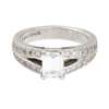 claw set with an emerald-cut diamond, the split shoulders pavé set with round-brilliant cut diamonds, to a white metal shank stamped PLATINUM
