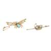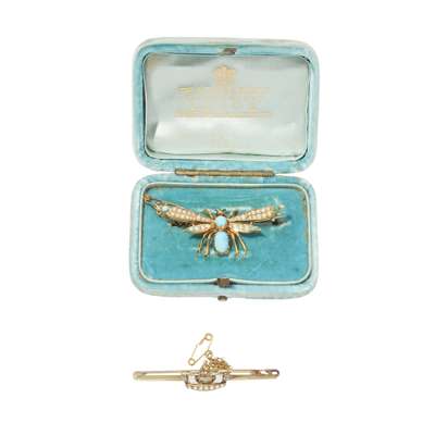 the first modelled as a winged-bug, set with seed pearls, turquoise cabochons and small round cut garnets, stamped 15ct; the second modelled as a crown with enamel and seed pearl detail, to a plain bar brooch, stamped 9ct (2)