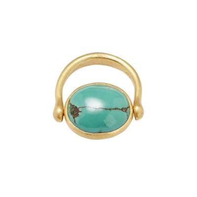 collet set with a turquoise cabochon within a swivel mount, to an 18ct yellow gold matte shank