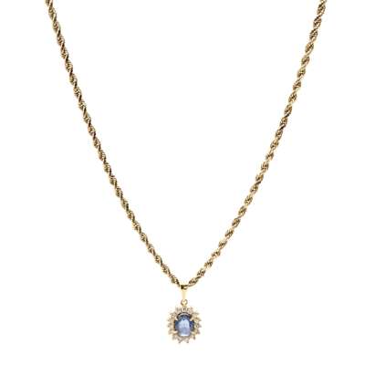 the pendant claw set with an oval-cut sapphire, in a single border of small round-brilliant cut diamonds, suspended from a rope-twist chain stamped 750; together with a matching pair of sapphire and diamond cluster earrings (2)