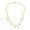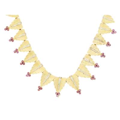 compsed of tapering bi-coloured stylised leaf links, the central links set with trios of small round cut rubies, to a concealed clasp and safety clip