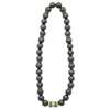 composed of a single strand of uniform haematite beads, set at intervals with eight channel set emerald spacers, the clasp similarly set, stamped 750