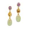 each collet set with an oval-cut amethyst and citrine, suspending a faceted prehnite pendant, to 18ct yellow gold post and butterfly fittings