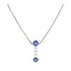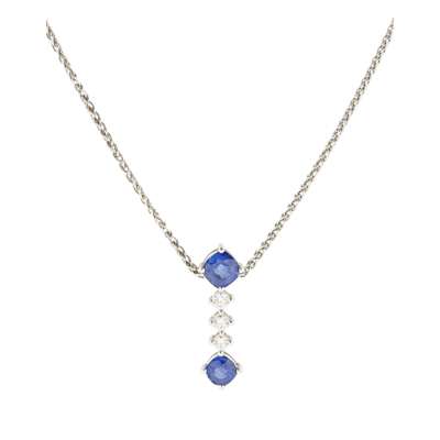claw set with a cushion-cut sapphire, above a row of three graduated round brilliant-cut diamonds and a smaller cushion-cut sapphire, to an 18ct gold fox link chain