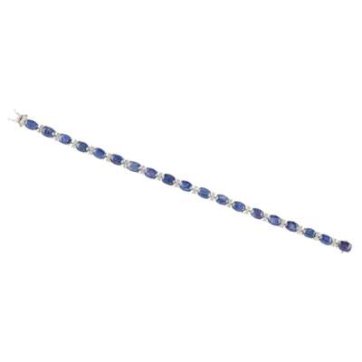 claw set with a single row of oval-cut sapphires, between pairs of small round brilliant-cut diamonds, to a concealed clasp and safety clips