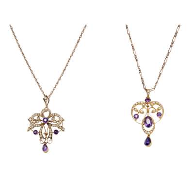 both of scrolling design and set throughout with seed pearls and amethysts, one stamped 15ct, to associated fancy link chains (2)