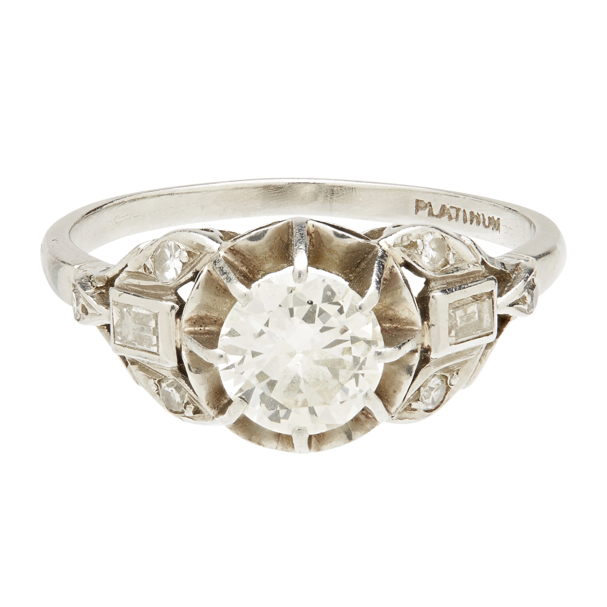 claw set with a round brilliant-cut diamond, each shoulder set with a baguette-cut diamond and three graduated eight-cut diamonds, to a plain shank, stamped PLATINUM